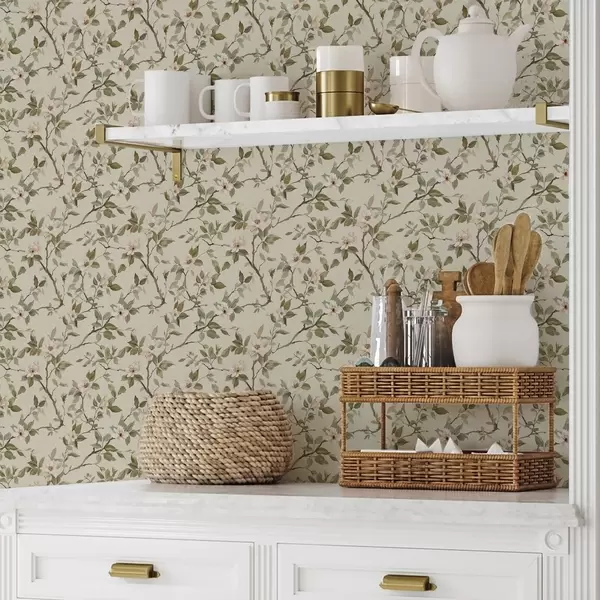 Papel tapiz Ramas ligeras con pequeñas flores color crema y hojas verdes Nr. a01028