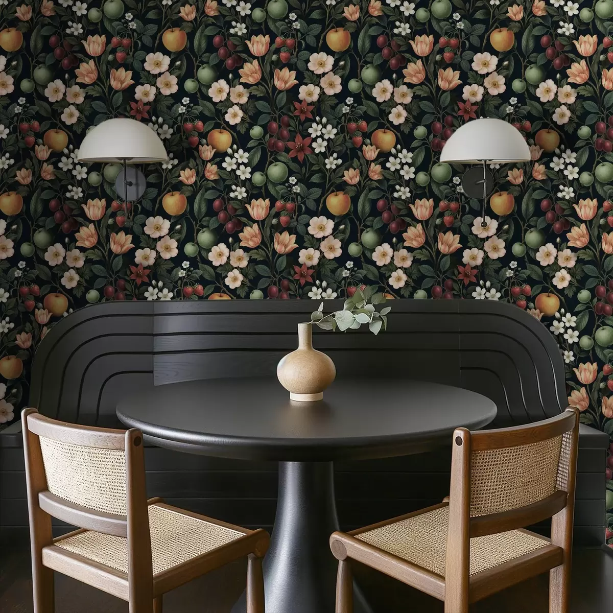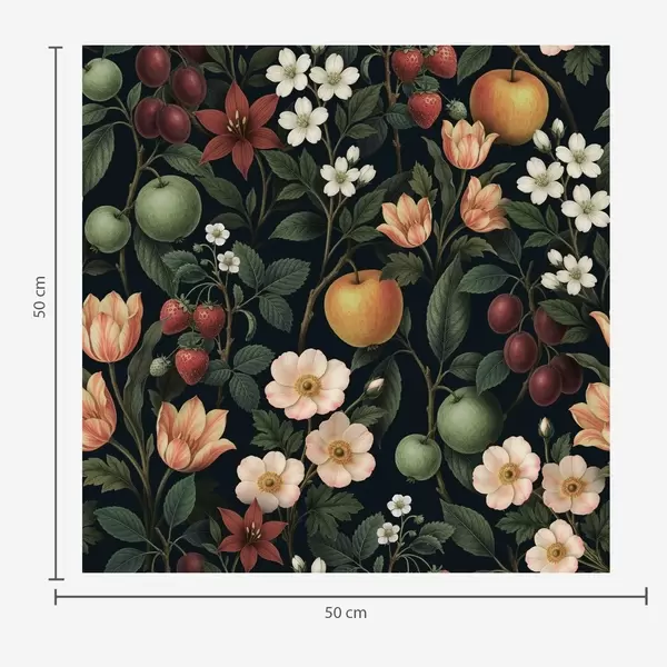 Papel tapiz Jardín oscuro con flores, manzanas maduras y bayas. Nr. a01034