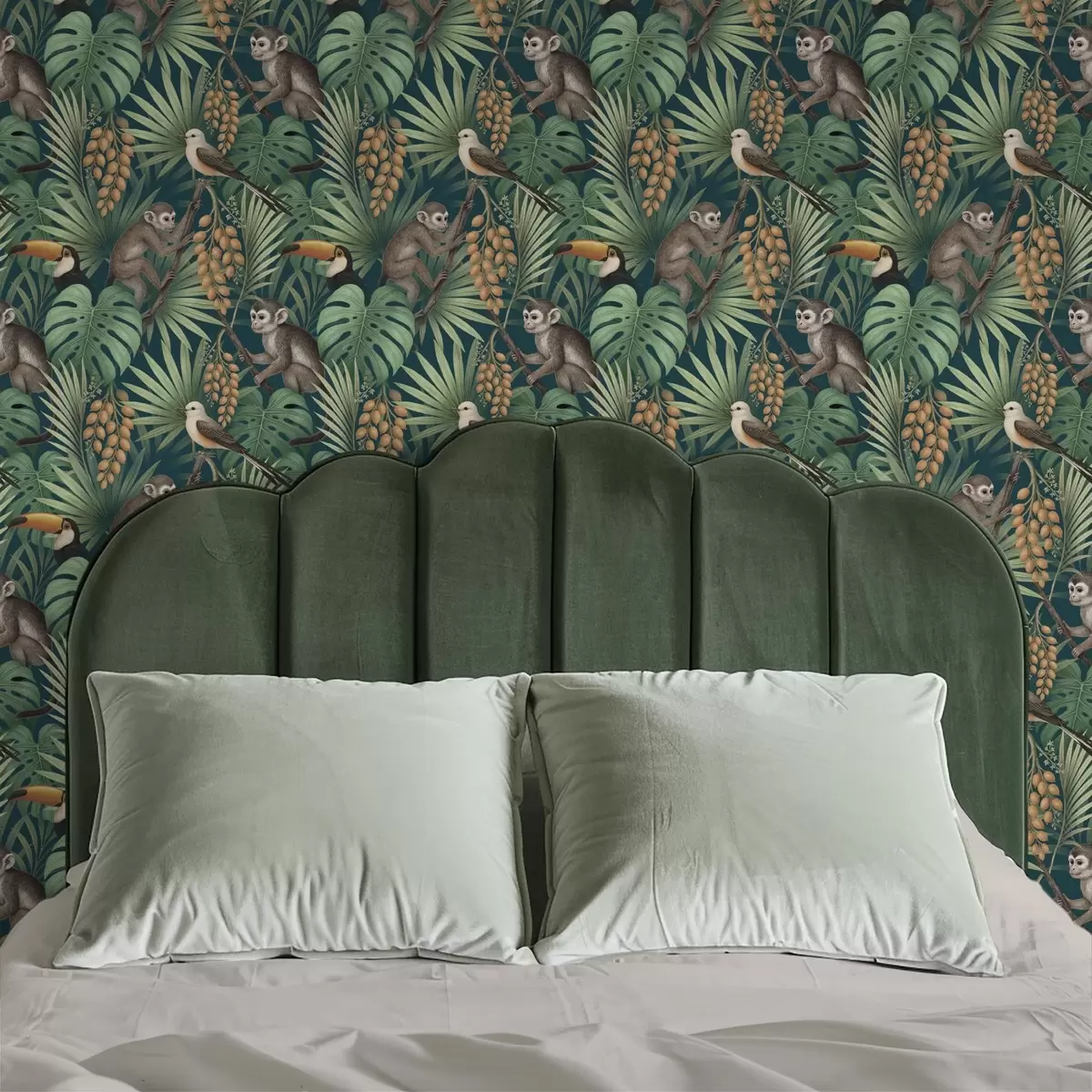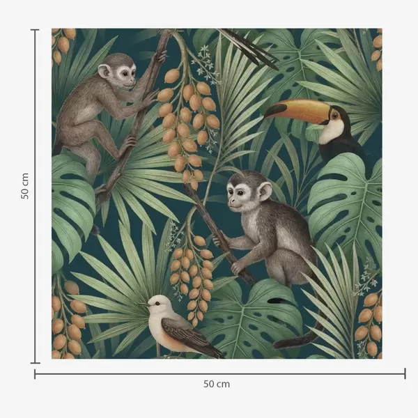 Papel tapiz Monos y aves tropicales en la densa vegetación de la selva. Nr. a01037