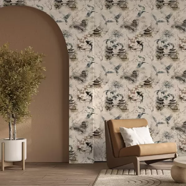 Papel tapiz Templos japoneses, peces koi y grullas sobre un fondo suave Nr. a01040