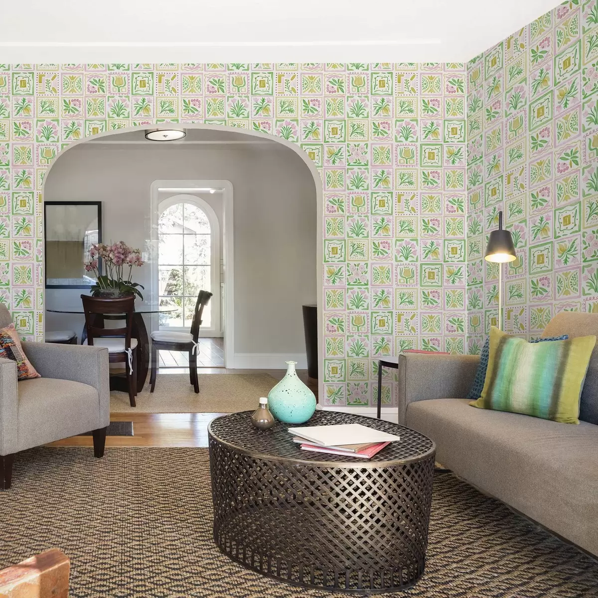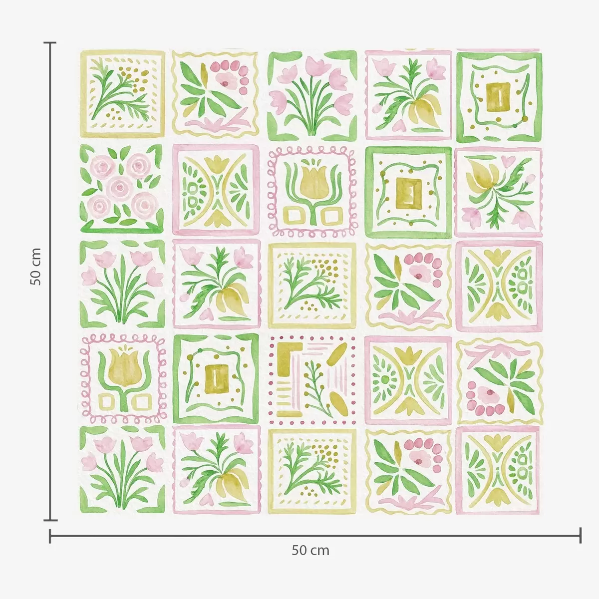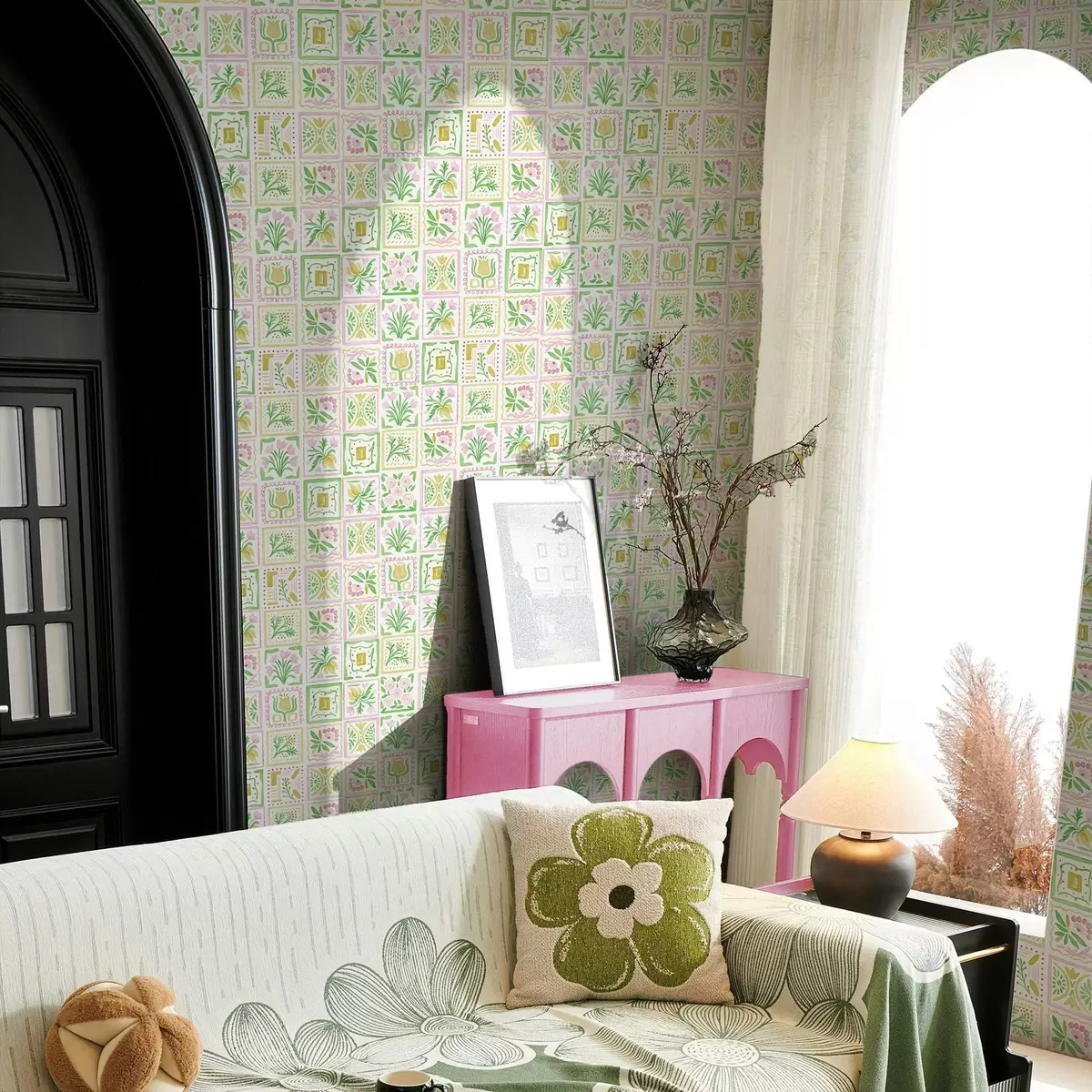 Papel tapiz Cuadrados acuarelados con ramas rosas y verdes Nr. a01082