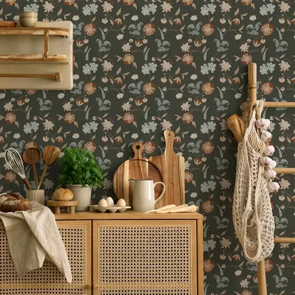 Papel pintado Fondo verde oscuro con flores y hojas decorativas a01086