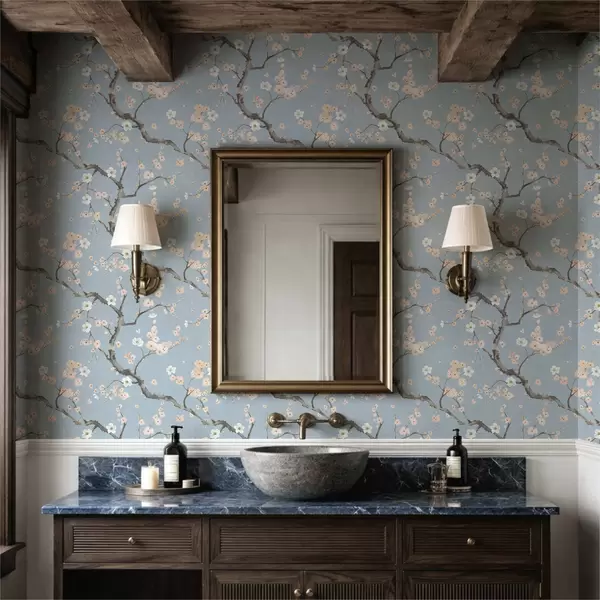 Papel pintado Ramas con flores sobre fondo azul a01155